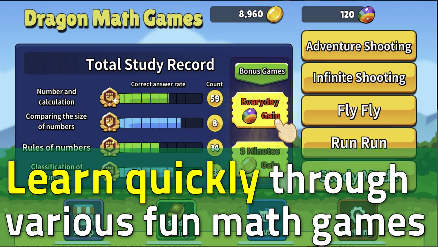 'Dragon Math Learning Games' is the best way for elementary school and lower grade children to learn arithmetic skills.